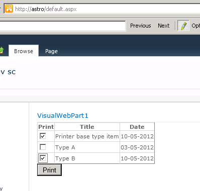The end result was a visual web part that uses the object model generated by SPMetal to display the contents of our MyPrintList list in an SPGridView, and adds checkboxes so that end users are able to select which of those items will be printed: