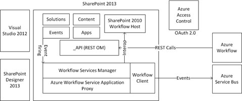 Figure 1 depicts a high-level view of the SharePoint 2013 workflow framework. Notice, first, how the new workflow infrastructure introduces the Windows Azure Workflow Manager Client as the new workflow execution host (denoted in the Figure as Azure Workflow). Whereas in previous versions workflow execution was hosted in SharePoint itself, this has changed in SharePoint 2013. Workflow Manager Client is external to SharePoint and communicates using common protocols (REST API calls over HTTP or HTTPS) over the Windows Azure service bus, mediated by OAuth 2.0.