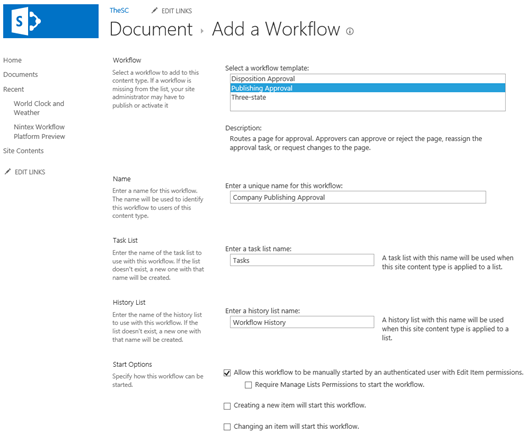 8. In the Start Options section you can specify if you want the workflow to be manually started by an authenticated user with Edit Item permissions. In effect, this means users that are administrators. With site workflows, there are not many options available for starting workflows: you can only start a workflow manually.