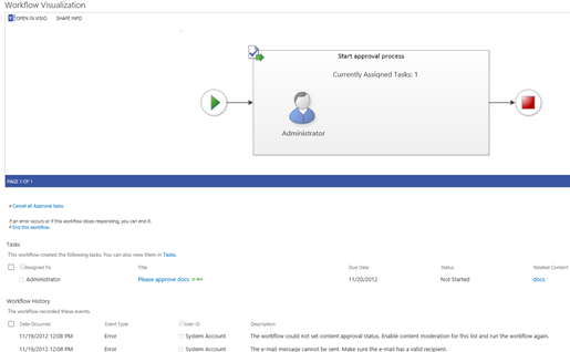 Let’s start the discussion of troubleshooting workflows by taking a look at the out of the box workflows. The first hint that an out of the box workflow contains an error is that the SharePoint item workflow status in the UI displays the Error workflow status. The best thing to do when this happens is to take a look at the history list of that workflow and figure out where the workflow went wrong. The most common errors are connectivity problems, incorrect email settings, or user permissions that are not correct, probably insufficient permissions.