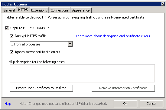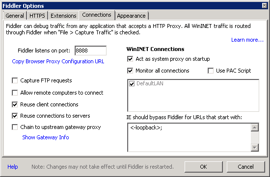 Figure 16 Specifying advanced Fiddler options to inspect SharePoint-WAW traffic.