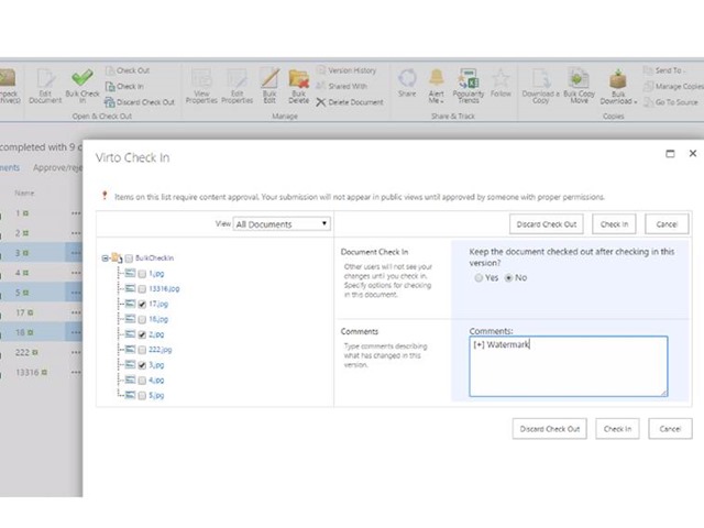 As the name implies, this component is for SharePoint multiple files checkin and SharePoint multiple files approval. It allows end users to check in bulk groups of documents and has features such as adding comments to the bulk whilst doing a check-in, publishing or drafting versions if