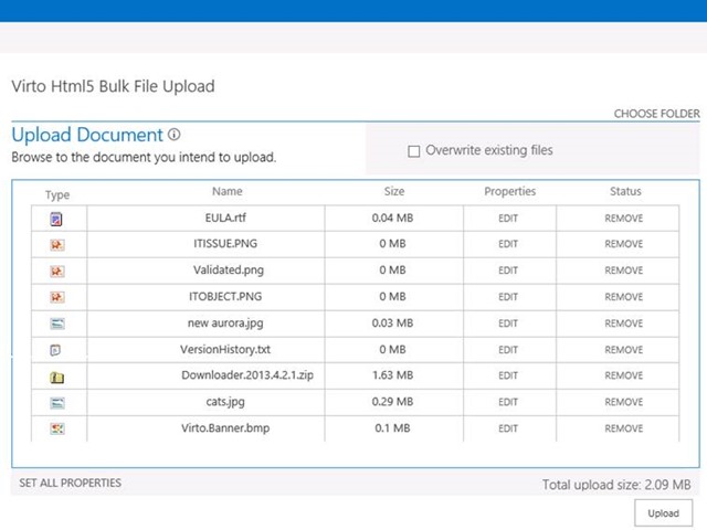 • The possibility to redirect all requests to the standard upload page to the Virto Bulk Upload (via an HTTP module).