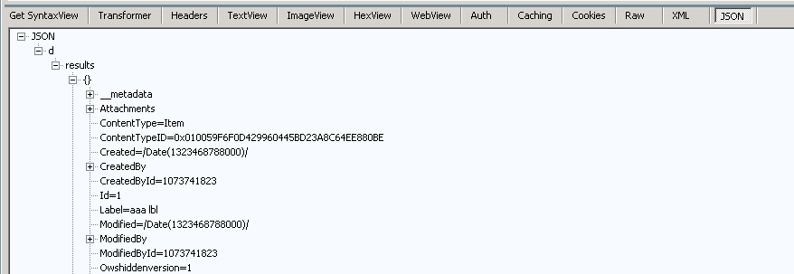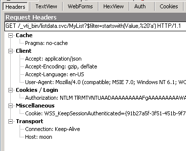 By default, the response is XML. For our purposes, we’re more interested in JSON. If you want to work with REST and JSON it’s absolutely essential to install a tool on your dev environment that’s able to capture HTTP traffic. Here, we’ll use Fiddler (http://www.fiddler2.com/fiddler2/).